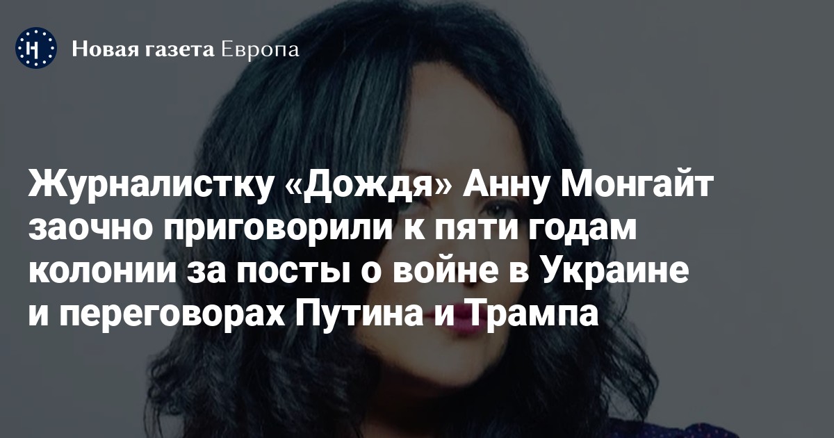 Пресненский районный суд Москвы заочно приговорил журналистку телеканала «Дождь» Анну Монгайт к пяти годам колонии общего режима по статье о военных «фейках» (п. «д» ч. 2 ст. 207.3 УК). Об этом сообщила «Медиазона» со ссылкой на корреспондента из зала суда.