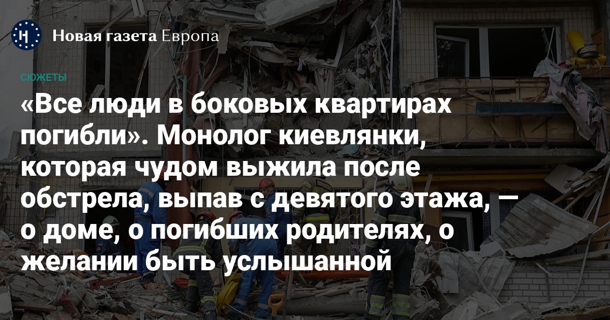 В ночь на 31 июля российские военные обстреляли Киев ракетами и беспилотниками. Погибли 32 человека, пострадали 159. 28 убитых жили в девятиэтажном доме в Святошинском районе — их подъезд был полностью разрушен ракетным ударом. В атаке чудом выжила Вероника Осинцева — 23-летняя выпускница Киевской муниципальной академии эстрадно-циркового искусства. Девушку выбросило из окна квартиры на девятом этаже вместе с кроватью, но она отделалась двумя переломами ноги и повреждением зуба. Ее родители и кот погибли, сама она провела в больнице месяц.