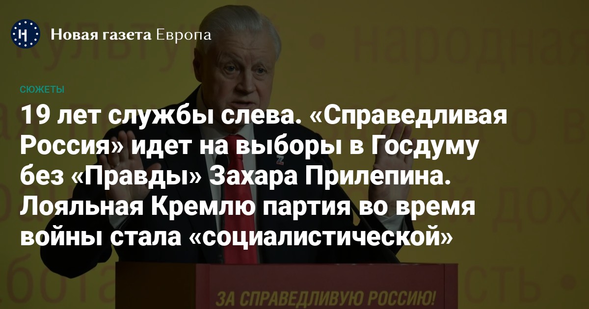 «Справедливая Россия» (СР) вывела из числа сопредседателей радикального патриотического писателя Захара Прилепина и готовится к выборам в Госдуму. СР планирует осваивать полностью лояльную Кремлю, но при этом левую социальную повестку. Собеседники «Новой газеты Европа» прогнозируют, что партия пройдет в следующий созыв Госдумы, а депутатами от нее станут либо люди, лояльные лично лидеру Сергею Миронову, либо те, кого попросит включить в списки администрация президента.