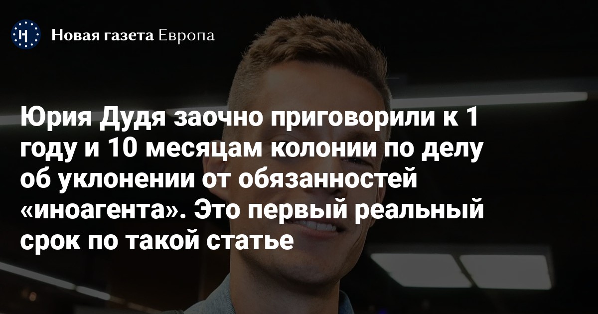 Судья московского мирового суда заочно приговорила журналиста Юрия Дудя к 1 году и 10 месяцам колонии общего режима по делу об уклонении от обязанностей «иноагента», сообщила «Медиазона».