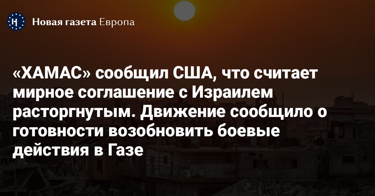 «ХАМАС» уведомил американскую сторону, что считает мирное соглашение с Израилем расторгнутым из-за систематических нарушений со стороны ЦАХАЛ. Движение заявило о готовности начать боевые действия в Газе, сообщает телеканал Al Hadath со ссылкой на источники.