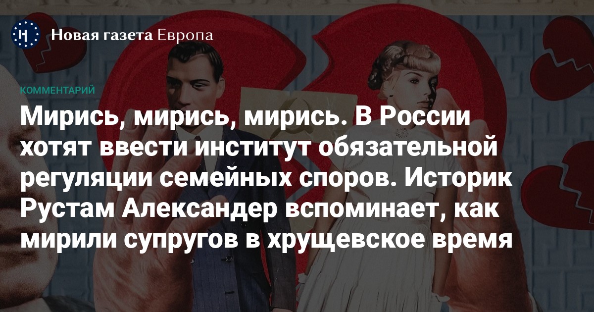 Россиян хотят заставить перед разводом проходить обязательную медиацию, чтобы таким образом попытаться урегулировать конфликт. Планируется, что мирить супругов будет посредник из специального утвержденного реестра. Этот шаг очень напоминает попытки советской власти укрепить браки во что бы то ни стало — особенно в хрущевское время.