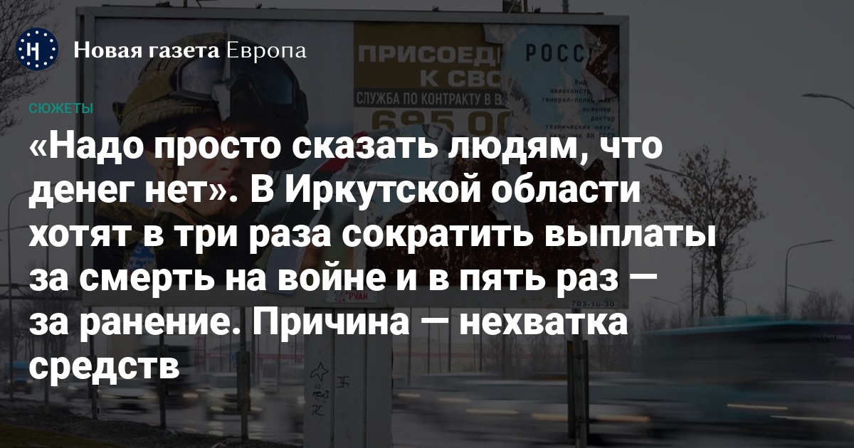 На заседании 18 марта, с видеозаписью которого ознакомилась «Новая-Европа», депутаты Заксобрания Иркутской области приняли в первом чтении законопроект, согласно которому выплаты за гибель участника войны сократят в три раза, за его ранение — в пять раз. Одновременно с этим выплата за подписание контракта в регионе вырастет в два раза.