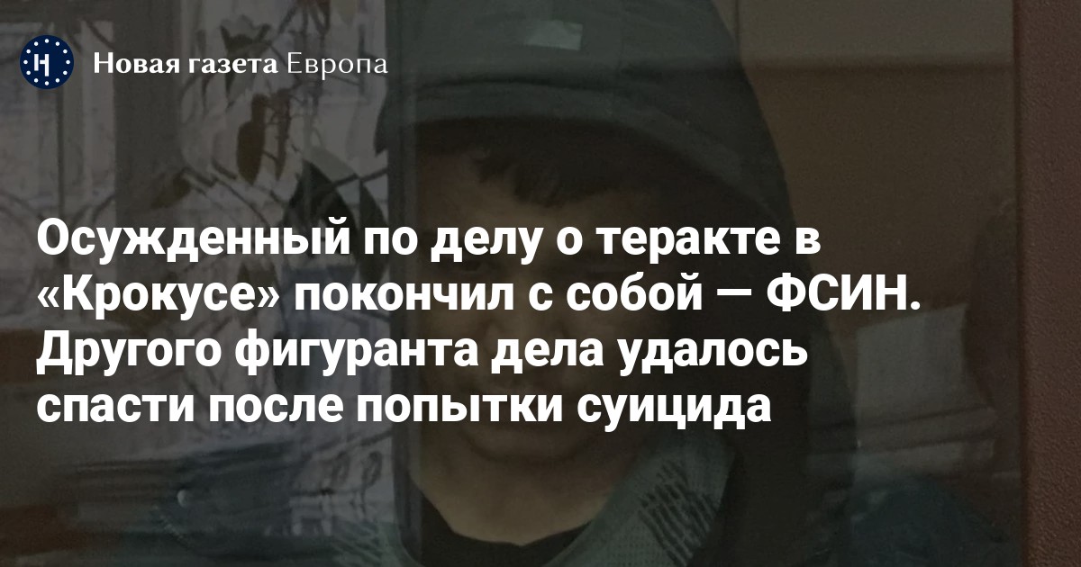 Адвокат пострадавших в результате теракта в «Крокусе» Даниэль Готье и источник РИА Новости в правоохранительных органах уточнили, что с собой покончил Якубджони Давлатхон Юсуфзода. Как утверждает связанный с силовиками телеграм-канал Mash, осужденный хотел повеситься в камере. Сотрудники ФСИН реанимировали мужчину, но он скончался по пути в больницу.