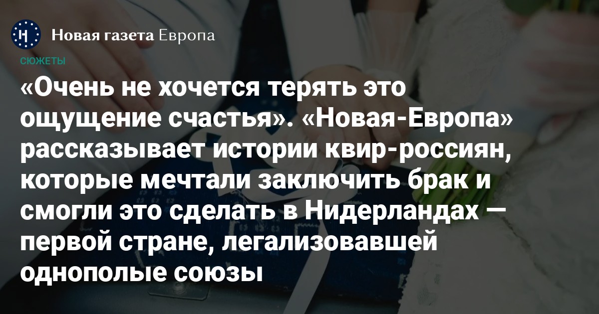 «Новая газета Европа» поговорила с двумя парами из России, которые эмигрировали и расписались в Нидерландах — на родине первых однополых браков. Россияне рассказали, как готовились к свадьбе и провели этот день, и что чувствуют люди, любовь которых после многих лет тайной жизни, наконец официально признана государством, хоть и не тем, в котором они родились.